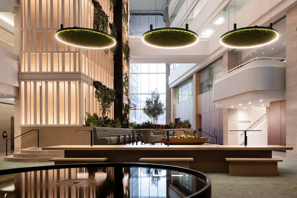 Evoking a Zen, otherworldly natural landscape, the refreshed space includes tree-like columns at the Yonge Street entrance, a reflecting pool, a vapor-based fire pit, hanging moss pendants, plenty of greenery and new seating, as well as a trellis that wraps the elevator bay, anchors the screen and preserves the original Travertine wall.